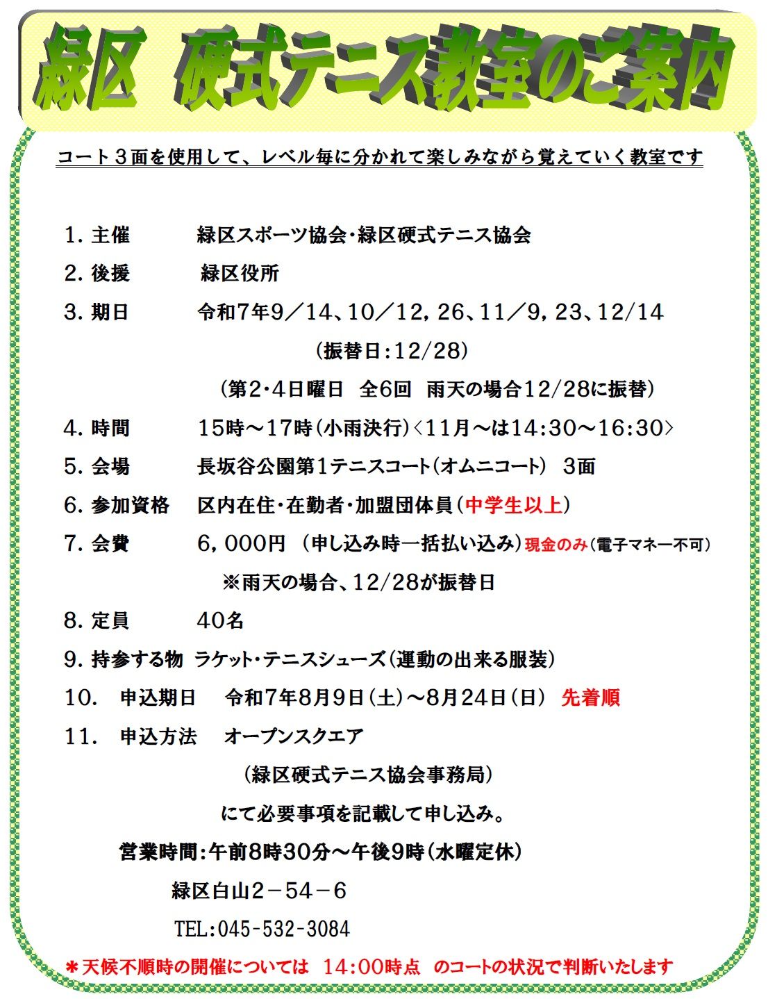 中学生以上の緑区内在住・在勤・在学者、または、緑区硬式テニス協会加盟団体員を対象にしています。